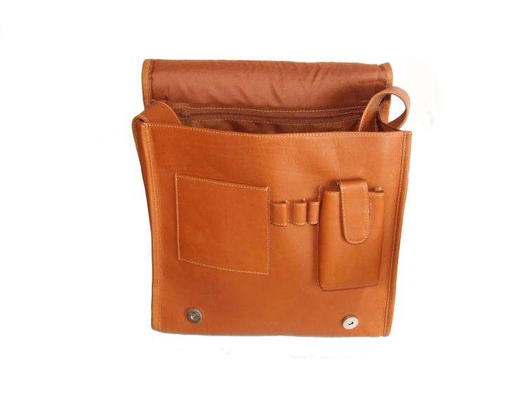 Pás přes rameno, uvnitř i vně další kapsa na zip. Pod přední šástí, která je zabezpečena ještě dvěmi magnetickými druky, je umístěno pouzdro na mobil a psací potřeby.